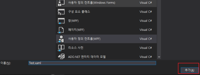 MainWindow.xaml로 돌아가서 빨간 사각형부분에 Text.xaml을 의미하는 <local:Test/>를 적어주면 Text.xaml이 출력됩니다.